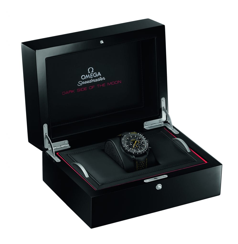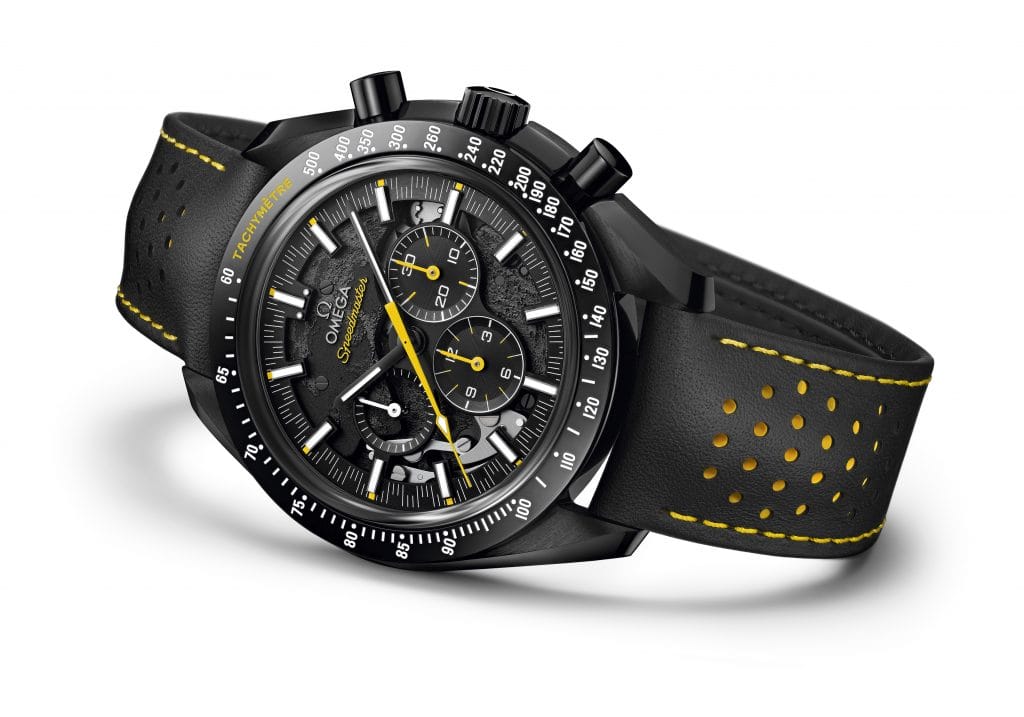 Avec cette nouvelle création, OMEGA fait à nouveau appel à une innovation indissociable de la ligne « Dark Side of the Moon » : la montre est entièrement façonnée en céramique noire à base d’oxyde de zirconium. La Maison a choisi un code couleur jaune qui contraste avec cette tonalité sombre. En 1968, OMEGA utilisait pour la première fois un code couleur dans la collection Speedmaster sur le modèle Speedmaster Racing. Aujourd’hui, le jaune, souvent associé à la vitesse, semble tout particulièrement adapté à cette montre. Les aiguilles du chronographe sont vernies de jaune tandis que l’échelle tachymétrique et la couronne sont revêtues de Super-LumiNova. La thématique jaune et noir s’étend au bracelet en cuir, qui intègre un insert en caoutchouc jaune révélé par des microperforations réalisées à l’aide d’un outil de fraisage.