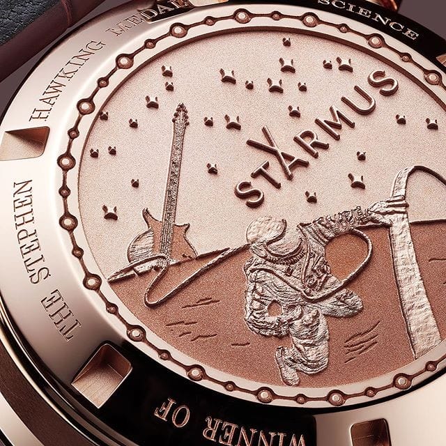 La montre des médaillés est une Speedmaster Moonwatch « First OMEGA in Space » en or Sedna™ 18K, réinterprétation de la montre emblématique portée par l’astronaute Walter Schirra lors de la mission Sigma 7 du programme Mercury en 1962. Elle arbore une lunette en céramique polie de couleur brune avec échelle tachymétrique en nitrure de chrome mat, des compteurs en PVD brun et un cadran central opalin argenté. Ce modèle se distingue par un fond de boîtier unique, frappé des mots « WINNER OF THE STEPHEN HAWKING MEDAL FOR SCIENCE COMMUNICATION » (« Lauréat de la médaille Stephen Hawking pour la communication scientifique ») et d’un médaillon gravé au laser qui reprend le motif de la médaille : le logo du festival Starmus accompagné d’un dessin d’Alexeï Leonov lors de la toute première sortie dans l’espace et de la guitare « Red Special » de Brian May, membre du groupe Queen.