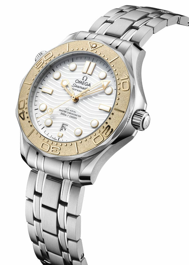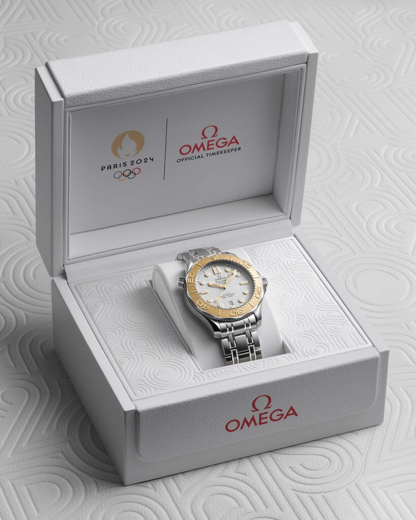 Ce nouveau garde-temps de 42 mm ne sera disponible que dans les boutiques OMEGA de la ville hôte, Paris. Cette montre est fabriquée en acier inoxydable et en or 18K Moonshine™️, l’alliage d’or jaune propre à OMEGA, qui offre une teinte plus subtile ainsi qu’une grande résistance à la décoloration. En tant que garde-temps des Jeux Olympiques, l’utilisation de l’or rappelle les médailles convoitées que chaque athlète s’efforce d’obtenir. L’or a été utilisé pour la lunette de la montre, qui présente une échelle de plongée structurée au laser en relief positif, ainsi qu’un point de Super-LumiNova à 12 heures.