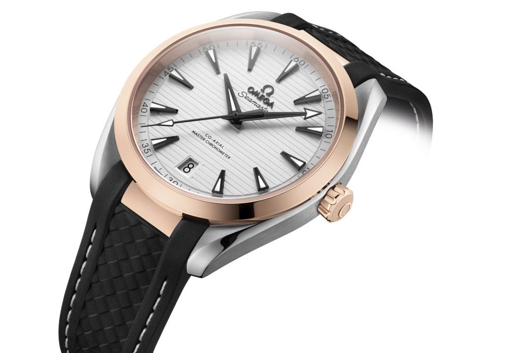 - Certains modèles 41 mm reposent sur un bracelet en caoutchouc, inédit dans la famille Aqua Terra, intégré au boîtier grâce à un maillon supplémentaire en acier inoxydable ou or Sedna™ 18K.