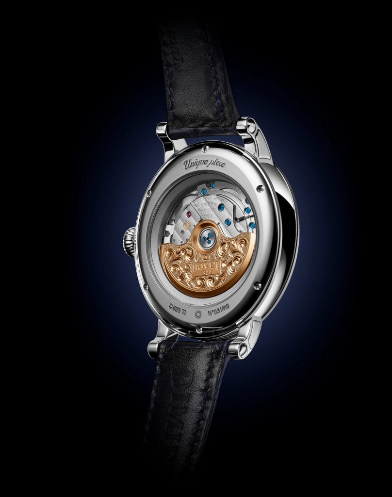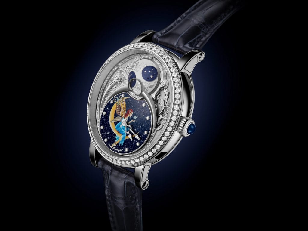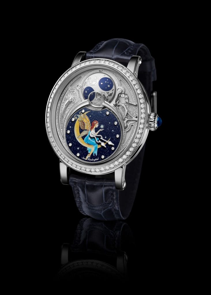 Une fée assise sur un croissant de lune est délicatement peinte sur le cadran des heures et des minutes. Un travail qui a demandé une centaine d’heures de concentration à l’artiste peintre miniaturiste pour immortaliser son sujet à l’aide d’un pinceau doté d’un unique poil de martre et d’un microscope binoculaire rendu indispensable par la miniaturisation du sujet. Un niveau de détails qui fait le succès de la Maison BOVET depuis près de deux siècles.