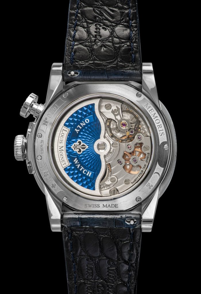 Le boîtier est en titane poli et est signé sur sa carrure de l’authentique signature de Louis Moinet. Il révèle tout l’envers du mouvement grâce à un fond saphir, autour duquel est gravée la mention « N°01/01 ». L’ensemble est remonté grâce à une masse oscillante décorée d’un clou de Paris concentrique laqué bleu et sur lequel est gravé la mention « ONLY WATCH ».