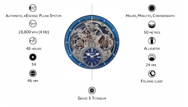 Les compteurs et le réhaut ont été réalisés dans une matière translucide de fabrication spéciale pour offrir une transparence totale sur le mécanisme du chronographe et sur sa platine en aventurine.