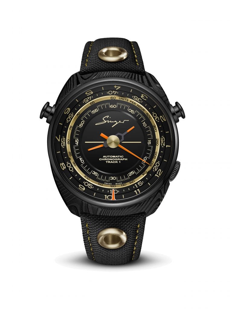 Le premier et le seul Chronographe Singer Track 1 réalisé en acier de Damas noir