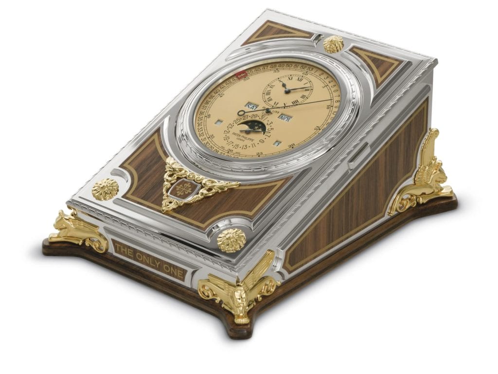 Pour concevoir cette pièce unique, Patek Philippe s’est inspirée d’une pendulette de bureau à quantième perpétuel et réserve de marche de huit jours fabriquée en 1922-1923 pour l’ingénieur et magnat de l’automobile américain James Ward Packard, l’un des plus fidèles et illustres clients de la manufacture. Un garde-temps exposé aujourd’hui au Patek Philippe Museum de Genève (PPM Inv. N° P-140). Mais les constructeurs ont reçu la mission de développer un tout nouveau calibre à remontage manuel doté d’une réserve de marche de 31 jours, d’une précision de +/– 1 seconde par jour et d’une praticité digne d’un mouvement du XXIe siècle.