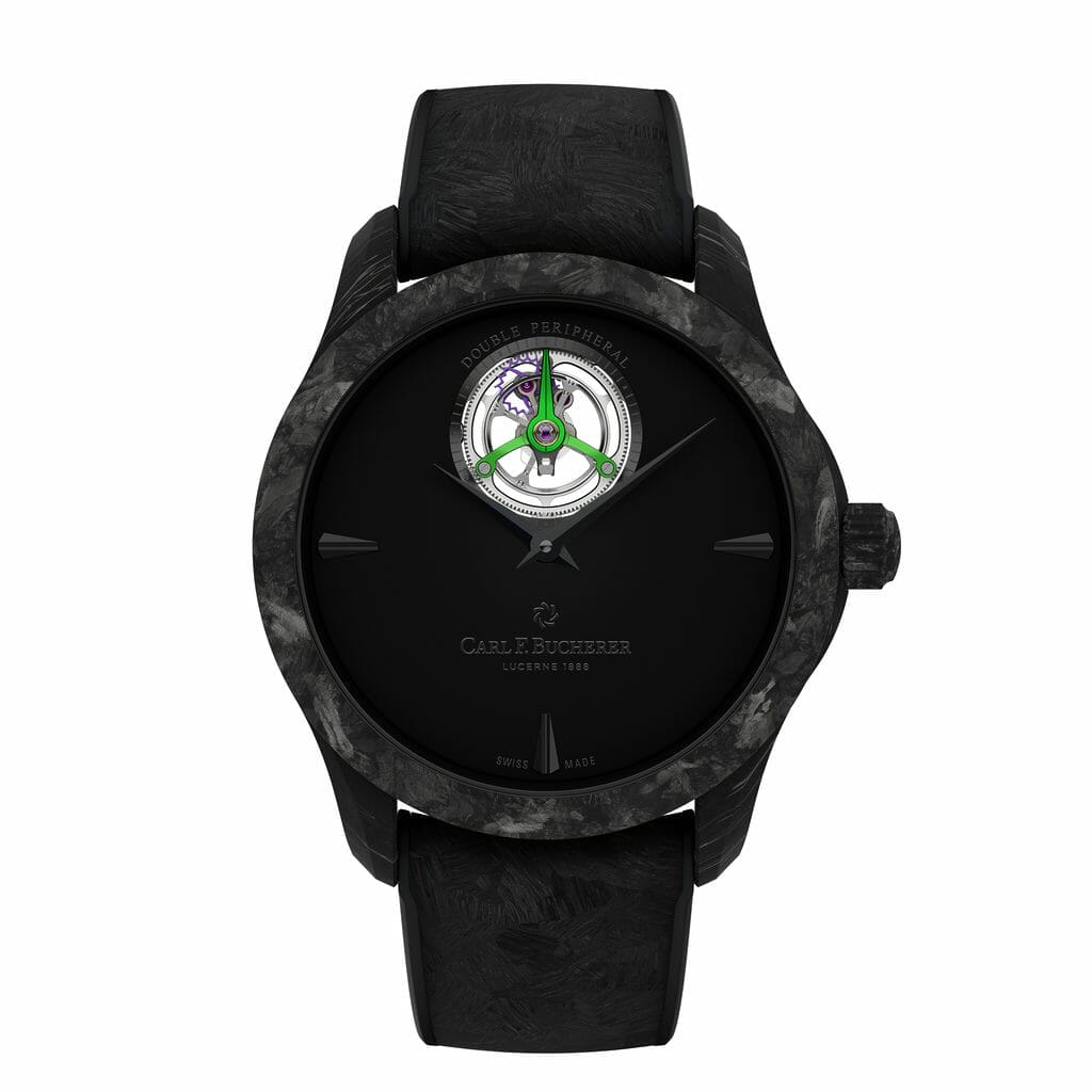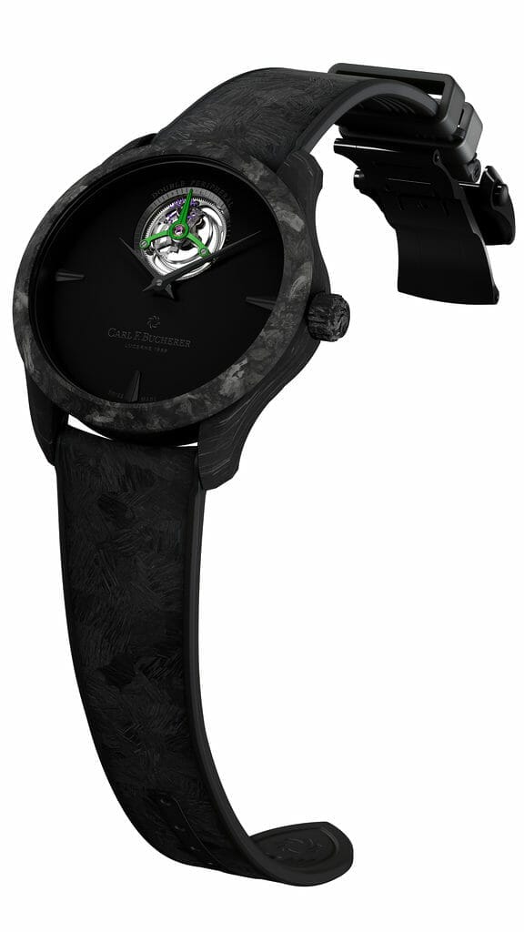 High-tech, le carbone forgé qui constitue le boîtier est l’une des toutes nouvelles matières employées par la manufacture horlogère. Plus léger et résistant que l’acier, il arbore une esthétique tout à fait unique à l’esprit urbain, marbrée de noir et mouchetée de carbone. Il est mis en valeur par un ensemble de composants presque entièrement noirs. Le cadran bombé noir mat est ponctué par les aiguilles dauphines anthracites et les index de forme dauphine à 3, 6 et 9 heures, créant un contraste de couleurs subtil et un design minimaliste. Le bracelet en caoutchouc hybride noir est assorti aux nuances de carbone du boîtier.