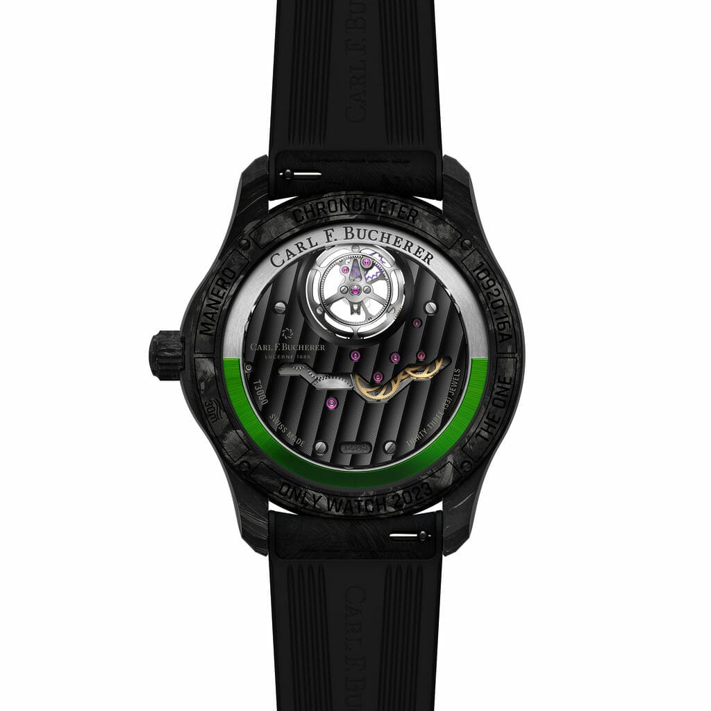 Cette apparence sombre est vivement contrebalancée par quelques composants choisis et finis dans une teinte percutante, assortie à la couleur du logo Only Watch. Côté face, un éclair de couleur à 12 heures souligne le tourbillon suspendu signature de CFB; son aiguille des secondes et ses bras de cage sont réalisés dans un vert captivant. Ni fixé à la platine principale du mouvement, ni suspendu à un pont, le tourbillon résistant aux chocs est maintenu en périphérie par trois roulements à billes et semble flotter dans les airs: c’est l’une des prouesses les plus sophistiquées de la marque.