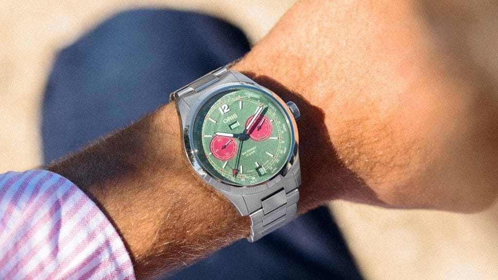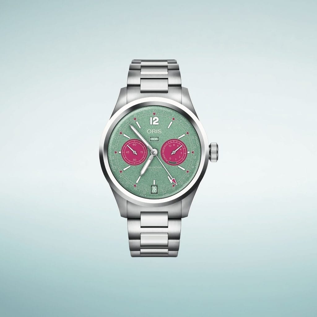 Oris a choisi un cadran vert mentholé ponctué de compteurs rose et d’index en or et blanc pour souligner les fonctions principales. Un choix assumé, pensé pour exprimer la dimension “joyful mechanics” chère à la marque. Le boîtier de 43 mm, la lunette fine et le bracelet acier à maillons effilés complètent la pièce sans détourner l’attention des indications calendaires.