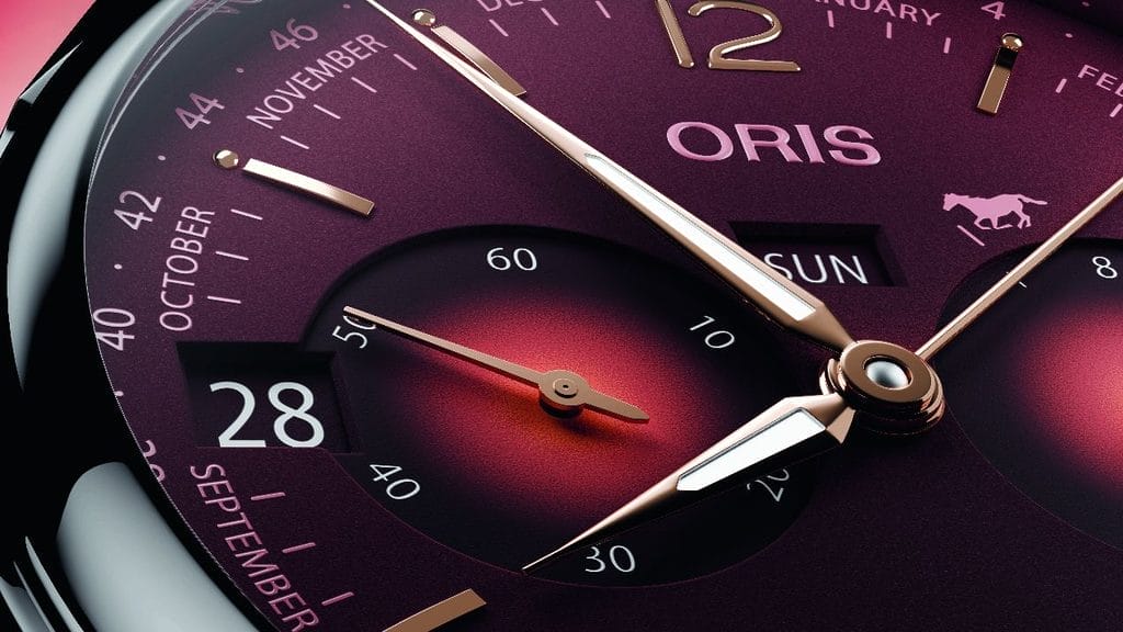 Clin d’œil poétique et symbolique, Oris a enrichi l’indicateur de réserve de marche de motifs représentant un cheval au galop et un cheval au repos. Ces illustrations apparaissent respectivement lorsque le ressort moteur est entièrement armé ou lorsqu’il approche de la fin de sa réserve, traduisant visuellement le cycle d’énergie et de repos, au cœur de la symbolique du Cheval.