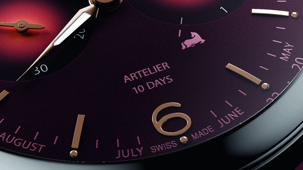 Dès le premier regard, cette édition limitée impose une présence singulière. Le cadran se pare d’un rouge profond et intense, évoquant la flamme cramoisie associée à l’élément feu. Les sous-cadrans, aux teintes ardentes, renforcent cette sensation de chaleur et de mouvement, tandis que le bracelet en cuir Cordovan brun foncé apporte un contrepoint plus terreux et organique à l’ensemble.