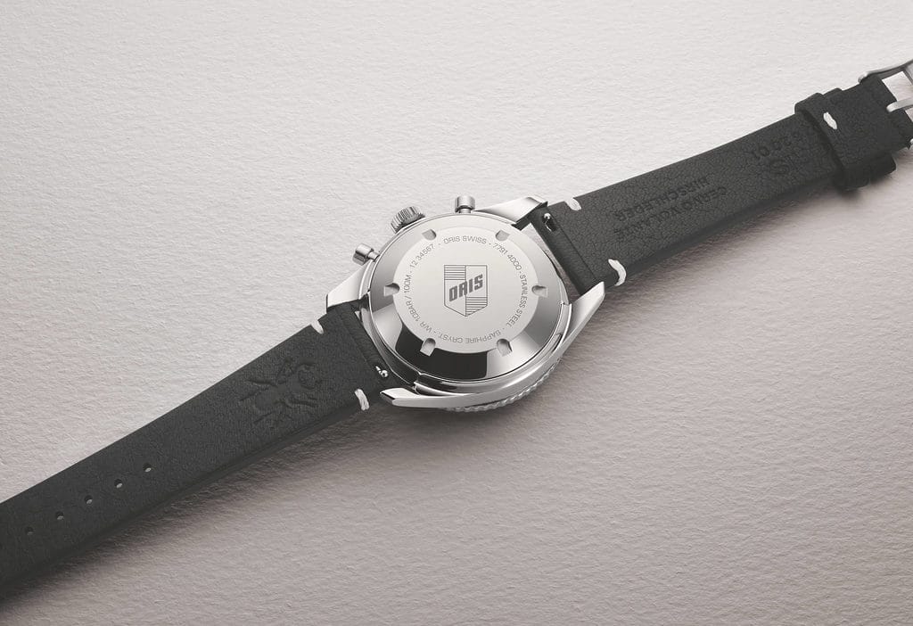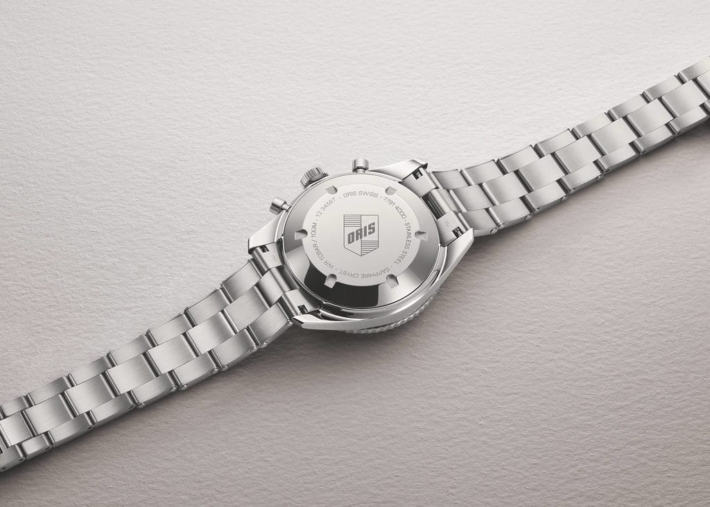 Sous cette allure rétro se cache un moteur de belle facture : le calibre Oris 771. Ce mouvement chronographe automatique propose une réserve de marche confortable de 62 heures, et affiche sur le cadran deux sous-compteurs (petite seconde et totalisateur 30 minutes), tout en offrant une lecture fluide grâce à la trotteuse centrale 1/4 de seconde. Étanche à 100 mètres, ce garde-temps conserve l’esprit utilitaire cher à la collection Divers.