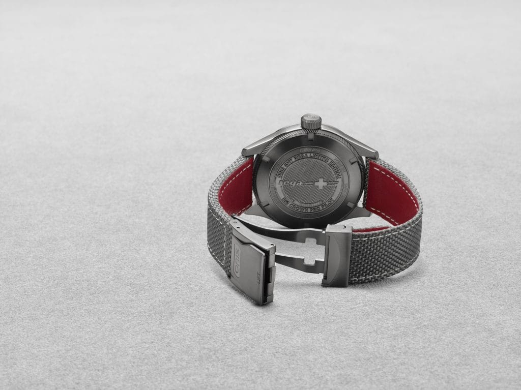 Couronne vissée en acier inoxydable avec revêtement PVD gris « canon de fusil ». Fond vissé, gravé de l’insigne de la Rega et du numéro d’édition limitée.