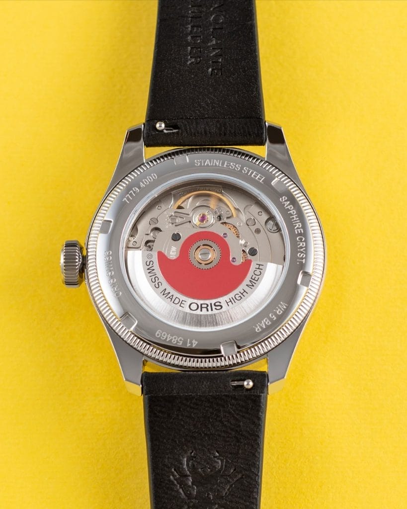 À l’intérieur, Oris reste fidèle à ses convictions en animant cette Big Crown Pointer Date Bullseye du calibre automatique Oris 754. Un mouvement éprouvé, fiable, offrant une réserve de marche de 41 heures et intégrant les fonctions essentielles avec rigueur : heures, minutes, secondes centrales, date par aiguille centrale, stop-seconde et correcteur de date. Ici, pas de surenchère technique inutile, mais une mécanique cohérente, pensée pour durer et accompagner le quotidien.