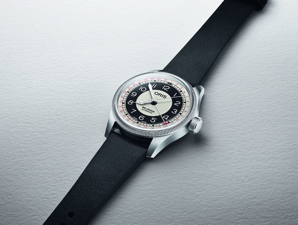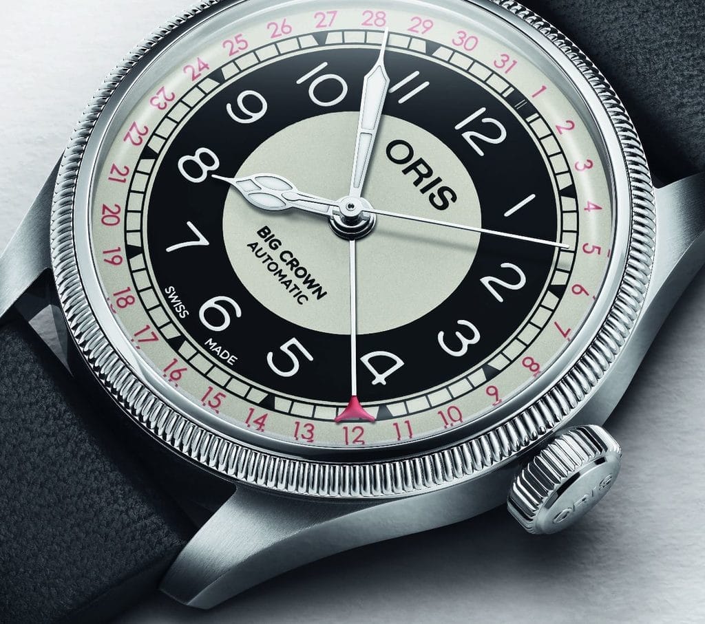 Avec la Big Crown Pointer Date Bullseye, Oris choisit de revisiter une autre facette de son histoire. Le cadran concentrique bicolore, surnommé Bullseye par les collectionneurs, plonge ses racines dans les premières décennies du XXe siècle. Dès les années 1910, ce type de cadran apparaît sur des montres de poche, avant de connaître un véritable âge d’or entre les années 1940 et 1970. Oris y avait déjà fait référence à plusieurs reprises, notamment en 1998, avant que ce design ne disparaisse à nouveau des collections.