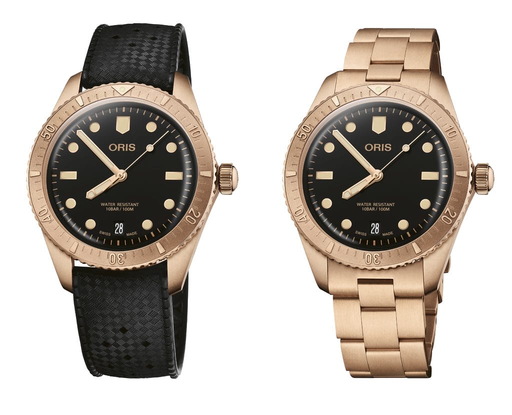 Le boîtier de 38 mm, la lunette tournante unidirectionnelle et la couronne vissée sont en bronze, tout comme la seconde proposition de bracelet. La teinte vintage se retrouve dans les détails du cadran, où nous avons ajouté des aiguilles et des index à bordures dorées, et les avons remplis de luminescence blanc cassé aux reflets verts dans l’obscurité. L’aiguille des secondes adopte une forme lollipop, qui rend hommage à l’esprit classique des montres de plongée. Même le logo Oris est de couleur bronze. Comme pour les précédentes versions en bronze de la Divers Sixty-Five, le matériau se patinera naturellement avec le temps en s’oxydant, donnant à chaque montre une finition unique qui évoluera en fonction de la vie de la montre.