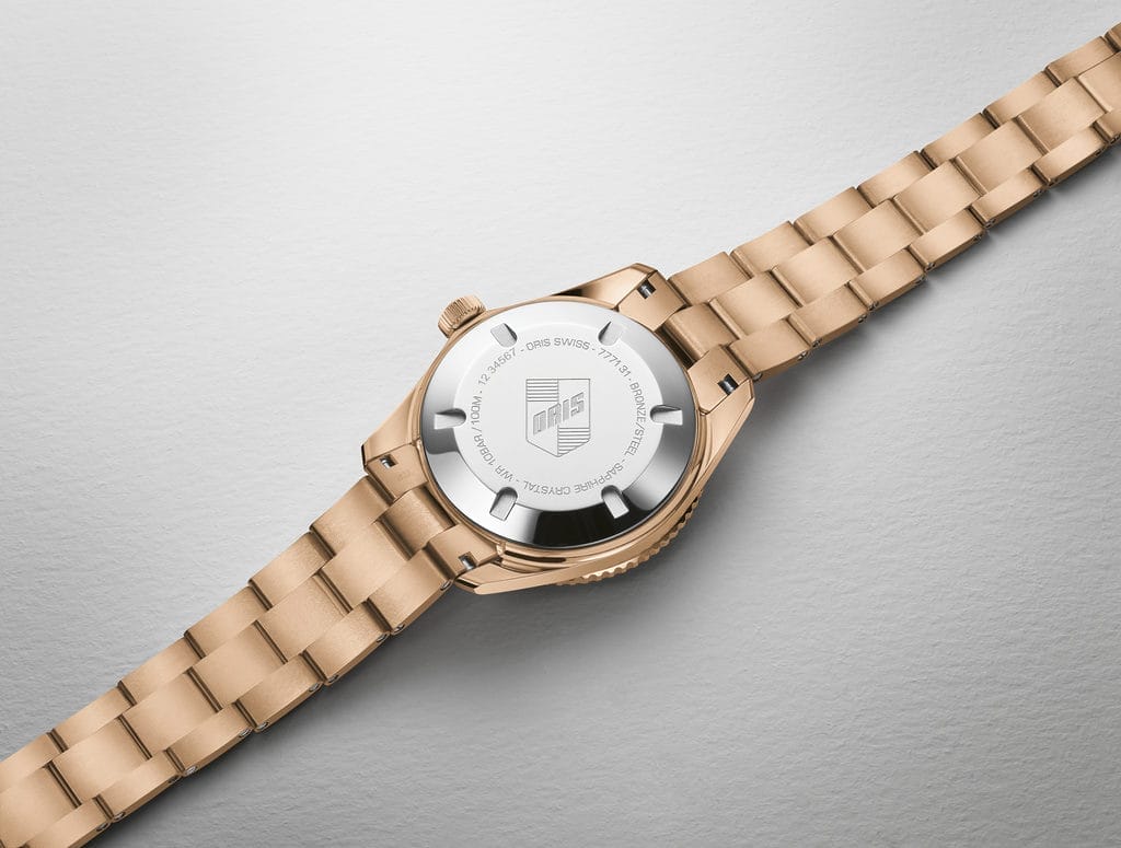 Le fond du boîtier est en acier inoxydable et gravé de l’écusson Oris. Comme toutes les montres Oris, elle est animée par un mouvement mécanique de fabrication suisse, qui assure ici les fonctions d’heure et de date.