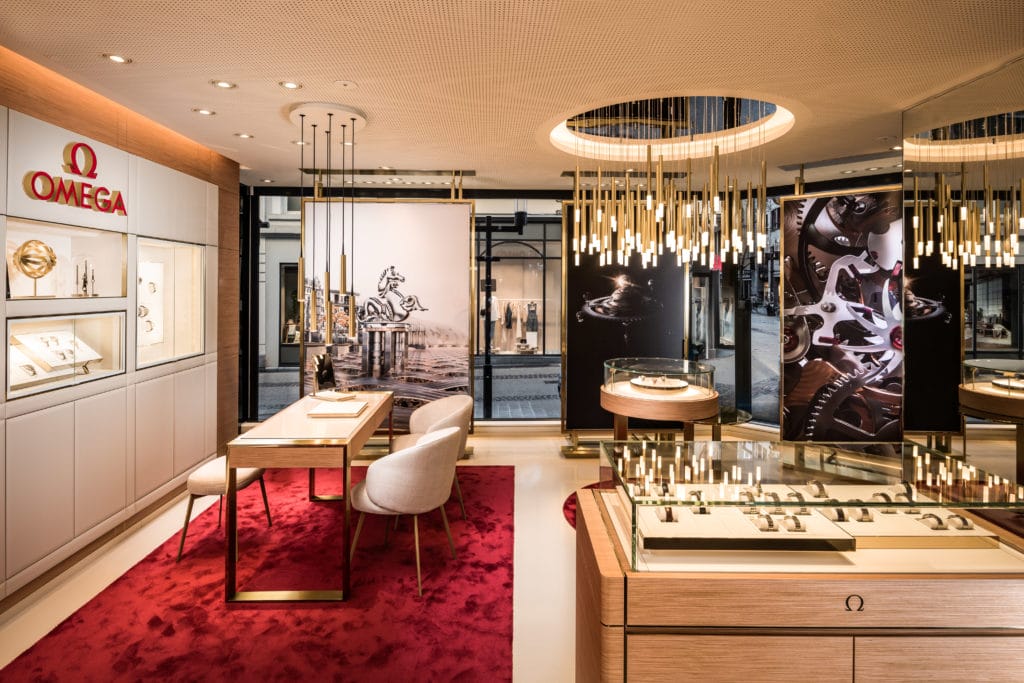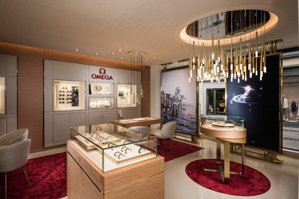 Cet écrin de lumière de 50m2 illustre avec élégance et précision la nouvelle identité visuelle d’OMEGA : de grandes vitrines d’angle créent un jeu subtil entre transparence et discrétion, et mettent en valeur, telles des icônes modernes, les garde-temps OMEGA. La combinaison inédite de matériaux tels que le zebrawood, la roche calcaire, et le laiton poli, associée aux touches de rouge et aux prodigieux luminaires suspendus, confère aux lieux une atmosphère moderne, vivifiante et chaleureuse.