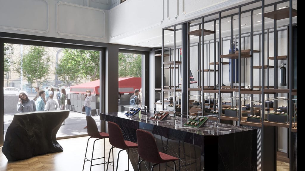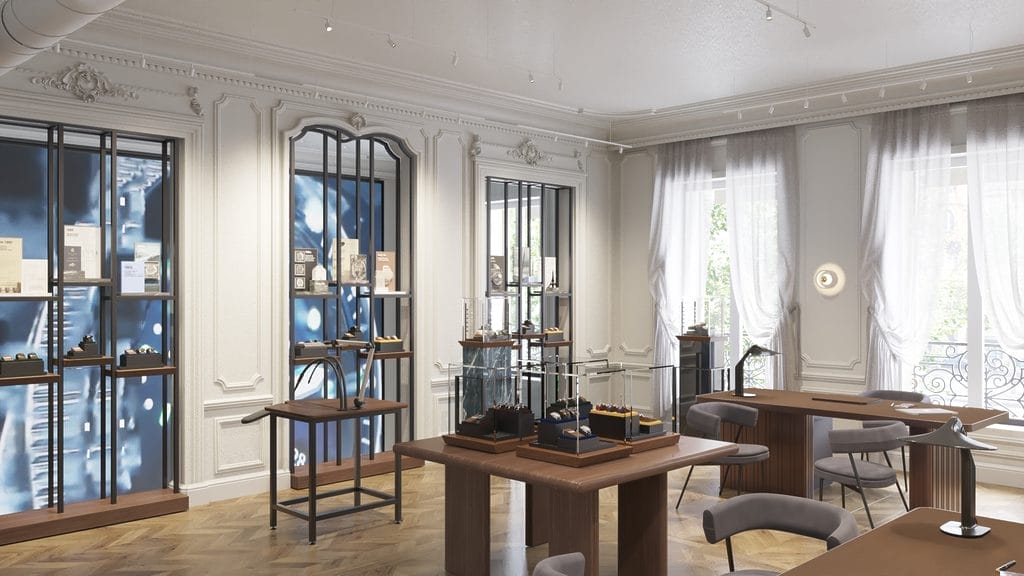 Cette boutique parisienne, la plus grande de France, occupe une surface de 200 mètres carrés. Sa conception s’apparente non pas à une rénovation traditionnelle mais à une véritable restauration. Agrandi et magnifié l’espace a été pensé en parfaite harmonie avec son illustre passé. Offrant deux facettes distinctes, il célèbre ses origines classiques et apporte aussi une touche industrielle et moderne, articulant une symbiose entre passé et présent.