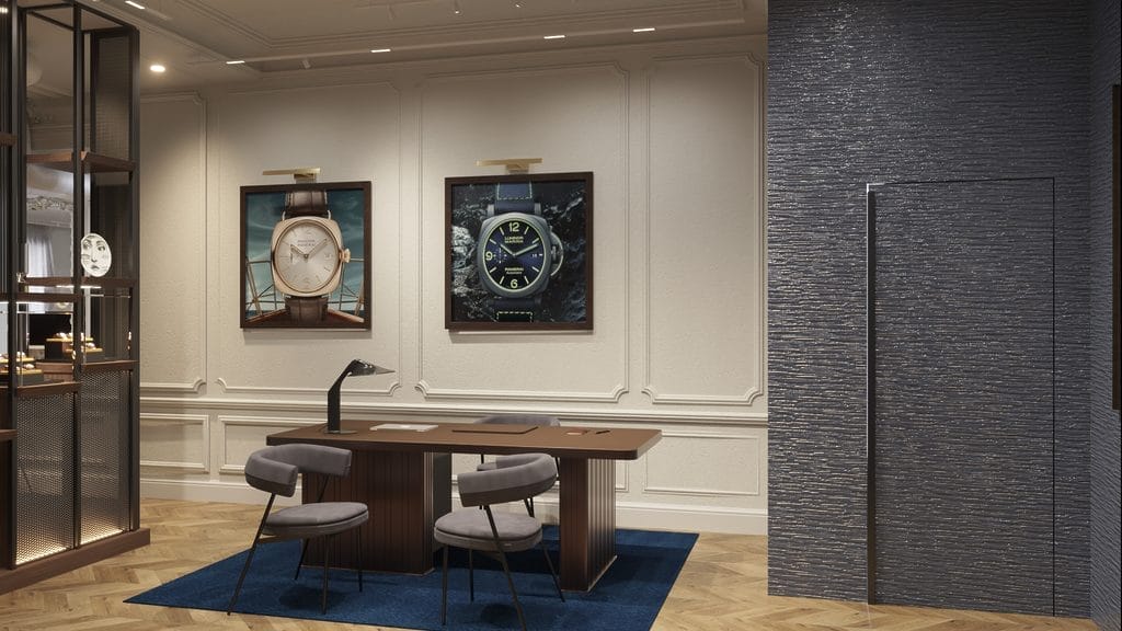 A contrario des boutiques traditionnelles, les vitrines ne présentent aucune montre. L’accent est ici mis davantage sur la découverte. Au moment où le client entre en boutique, il est accueilli, pour une expérience personnalisée et sur mesure. Nos invités sont ensuite orientés vers l’un de nos 5 espaces de vente, conçues pour offrir une expérience intimiste de l’univers Panerai, avec notamment un espace dédié aux femmes, décoré de mobilier rond et doux, dont les murs sont recouverts de résine bleue bigarrée évoquant les nuances kaléidoscopiques de la mer. On retrouve bien sûr l’emblématique horloge luminescente, une pièce entièrement fonctionnelle qui rappelle le thème fil rouge de la marque : la luminescence. Accentuant l’environnement immersif de la boutique, un immense mur LED se déploie sur deux niveaux pour une expérience boutique augmentée.