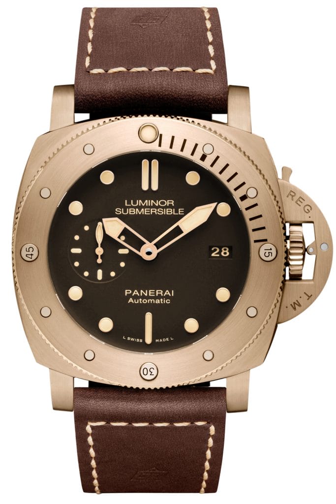 Un garde-temps qui célèbre les qualités ayant bâti la réputation de Panerai : des montres de plongée aux caractéristiques uniques et d’une excellence technique qui témoignent d’une forte inspiration historique. Le bronze utilisé pour le boîtier et le traditionnel pont protège-couronne est un alliage de cuivre et d’étain pur, extrêmement résistant à l’action corrosive de l’eau de mer et des agents atmosphériques. Ce matériau particulièrement robuste parvient à conserver sa teinte chaude d’origine, tout en revêtant un aspect vieilli grâce à la patine qui se forme au fil du temps. Cette patine résulte de la réaction du bronze face à l’environnement externe. Elle n’altère en rien les propriétés intrinsèques du matériau mais témoigne de son vieillissement. Les tons opulents du boîtier répondent au cadran brun foncé et au bracelet en cuir brun.