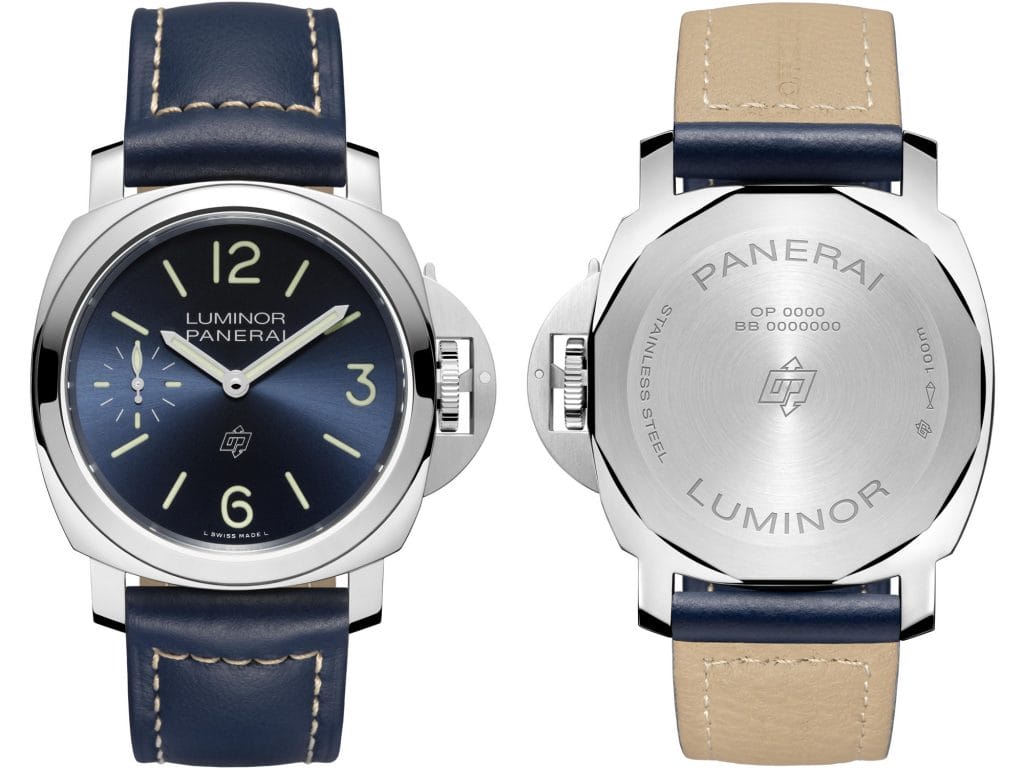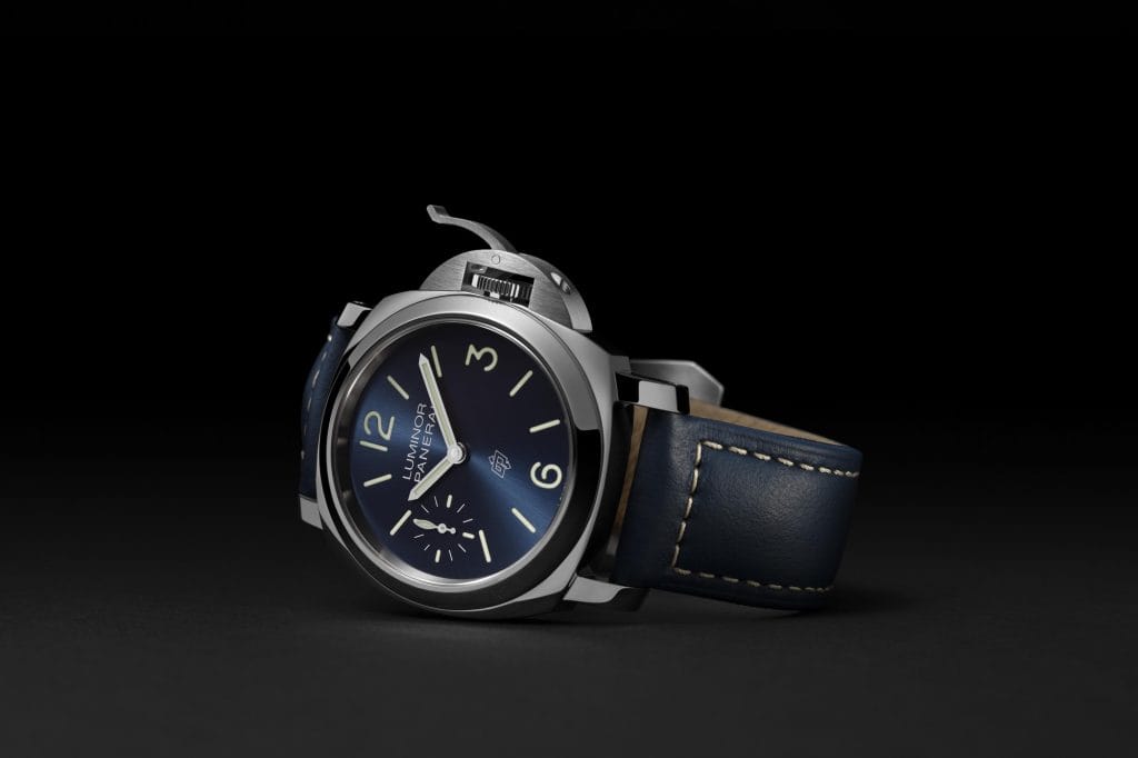 Étanche jusqu’à 10 bar (environ 100 mètres), la nouvelle Luminor Blu Mare – 44mm est montée sur un bracelet en cuir de veau bleu avec surpiqûres beiges fermé par une boucle ardillon en acier satiné. Elle est livrée avec un bracelet supplémentaire en caoutchouc bleu et un tournevis spécial pour changer les bracelets et ôter la boucle.