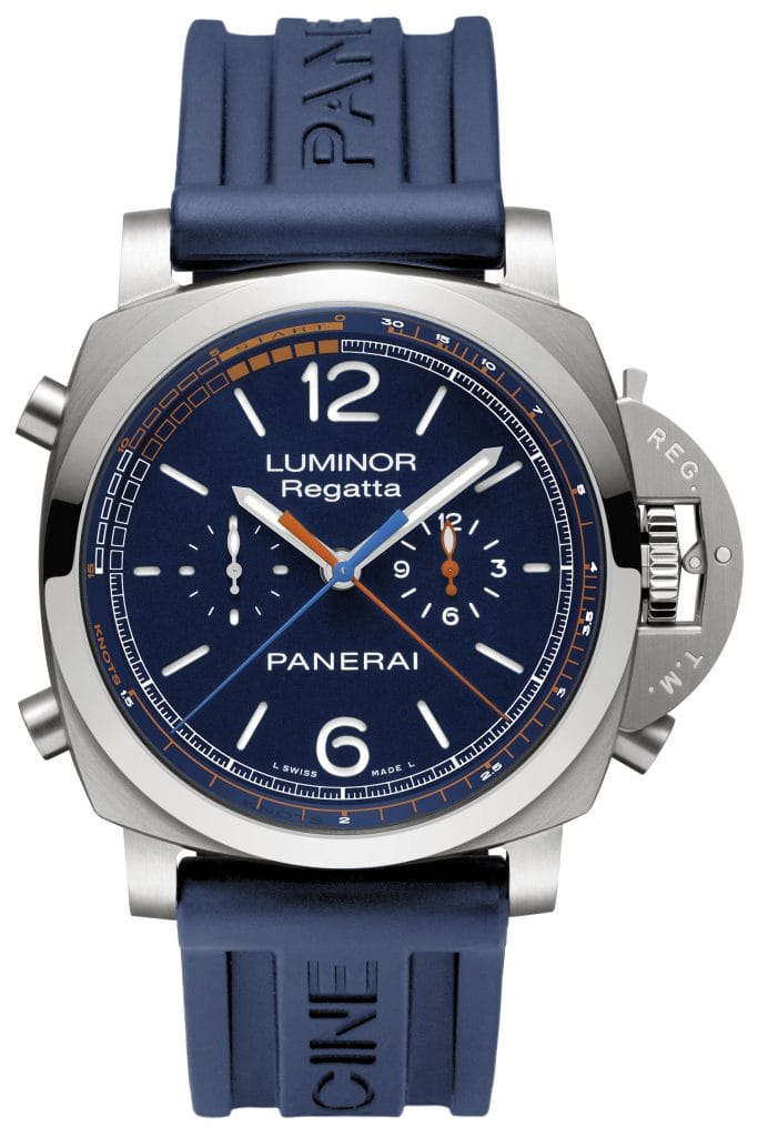 La montre se distingue par sa silhouette bleue, couleur du cadran et du bracelet en caoutchouc qui est mise en valeur par le boîtier en titane massif satiné et la lunette polie. La nouvelle Luminor Regatta Transat Classique est une montre chronographe conçue pour tous les amoureux de la mer. Celle -ci est équipée de la fonction compte à rebours régate, qui permet de décompter les minutes et les secondes précédant le départ d’une course. Cette fonction doit sa grande simplicité d’utilisation à la technologie particulièrement novatrice incorporée au mouvement de chronographe automatique P.9100/R : le poussoir situé à 4 heures permet de positionner l’aiguille des minutes orange du chronographe selon la durée souhaitée du compte à rebours. Au déclenchement du chronographe, les aiguilles commencent à se mouvoir, égrenant les minutes et les secondes avant le départ. À l’expiration du compte à rebours, les aiguilles commencent à mesurer la durée écoulée depuis le départ de la course.