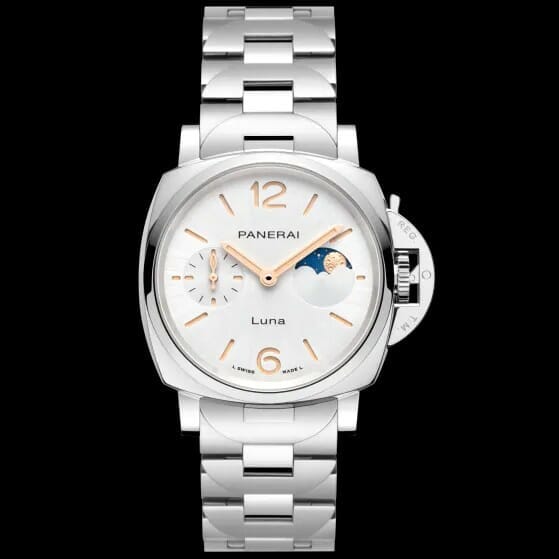 La phase de Lune, parmi les complications les plus poétiques, est au centre de la Luminor Due Luna, dont le nom signifiant « lune » en italien figure sur le cadran.