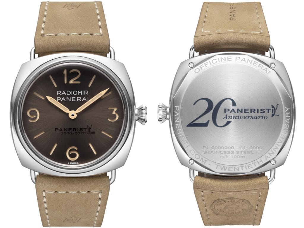 CADRAN : brun satiné soleil, structure sandwich, chiffres arabes et index en Super-LumiNovaTM beige qui devient vert dans l’obscurité. Avec la mention spécial « PANERISTI.COM 2000-2020 » gravée à 6 heures.
