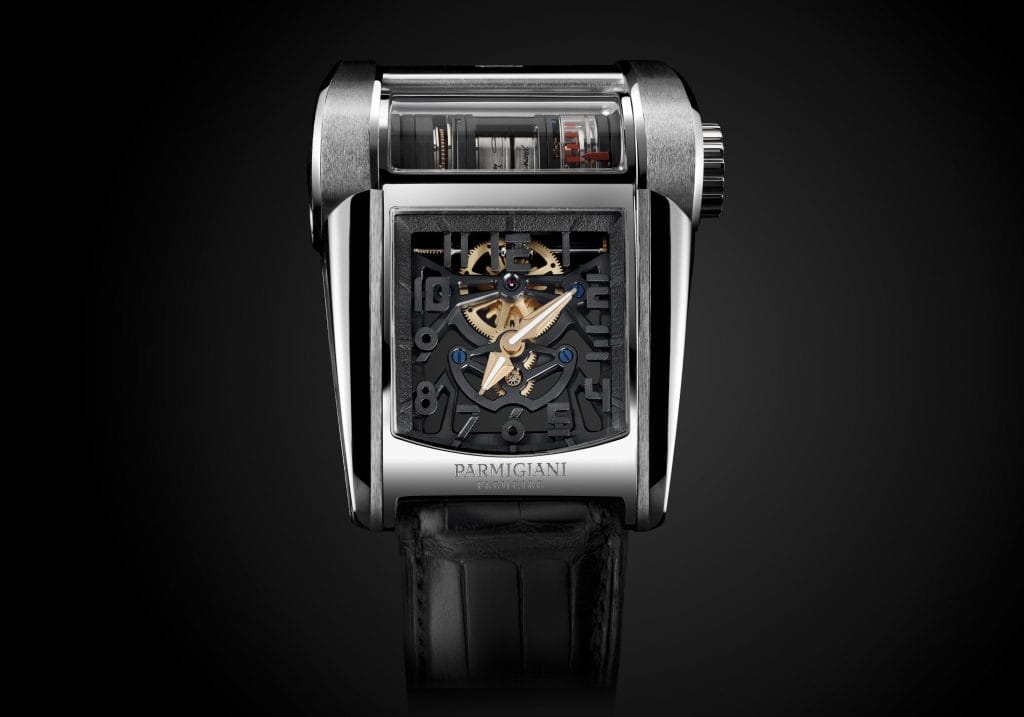 Egalement inspiré des composants utilisés pour la Bugatti Chiron, le mouvement PF390 est doté d’un différentiel à denture conique pour assurer l’indication de la réserve de marche. En concevant un tube d’affichage – en saphir – périphérique au mouvement, la manufacture Parmigiani Fleurier a développé cette construction inédite qui voit un rouage de réserve de marche entraîner une couronne dentée fixée à l’intérieur du tube. Ce cône pivote sur deux bagues de guidage et permet ainsi, grâce à une aiguille fixe, de lire la réserve de marche sur le tube.
