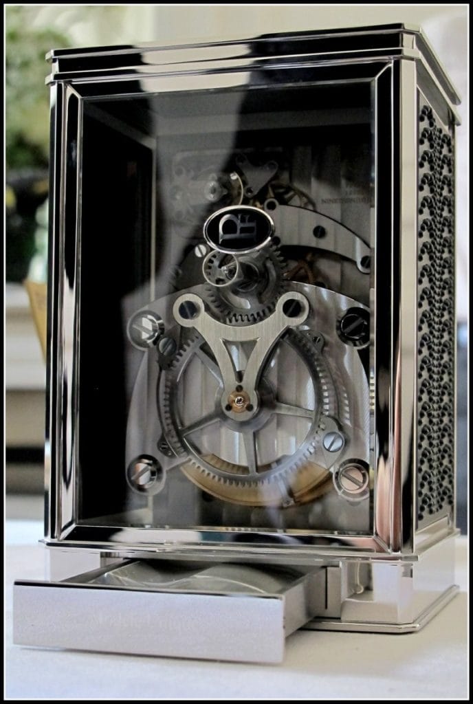 L’ensemble des panneaux de cristal permet de dévoiler la sublime mécanique de la Pendulette 15 jours. Envoutante, elle met en valeur le talent des deux compagnies, tant le travail de ciselage, de polissage et de précision des maîtres horlogers et des cristalliers est parfait.