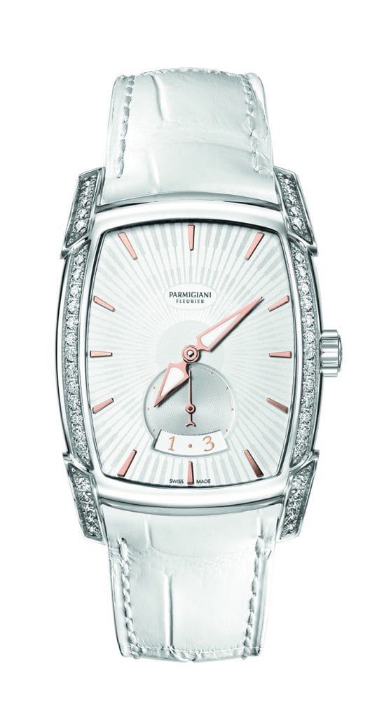 Comme c’est la coutume, Parmigiani Fleurier présente 10 Editions Spéciales de sa collection Kalpa, dont le cadran se pare d’un thème musical à l’honneur du MJF. L’évocation d’un clavier de piano orne le pourtour d’une Kalpa Grande – pour les hommes – et une Kalparisma sertie pour les femmes. Ce motif avec son alternance de touches noires et blanches s’obtient par une technique d’épargne. Après un satinage soleil, l’artisan cadranier masque les surfaces du motif qui doivent rester claires dans le décor final. Il sable ensuite les zones non protégées par l’épargne qui deviendront les touches noires et les interstices du clavier. C’est la mise en couleur galvanique qui révèle ces contrastes : la différence des deux traitements de surface, entre le sablé et le satiné font apparaitre comme par enchantement les touches d’un clavier.