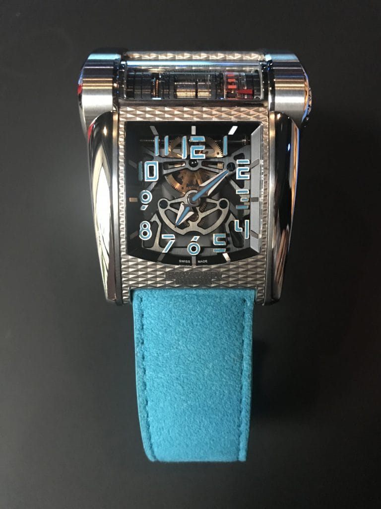 Pièce unique, cette « hyperwatch » en titane et carbone révèle un tourbillon, un indicateur de réserve de marche sur la partie supérieure tandis que le capot central dévoile les heures et minutes. Les index et le bracelet en alcantara reprennent le bleu utilisé sur le bolide.