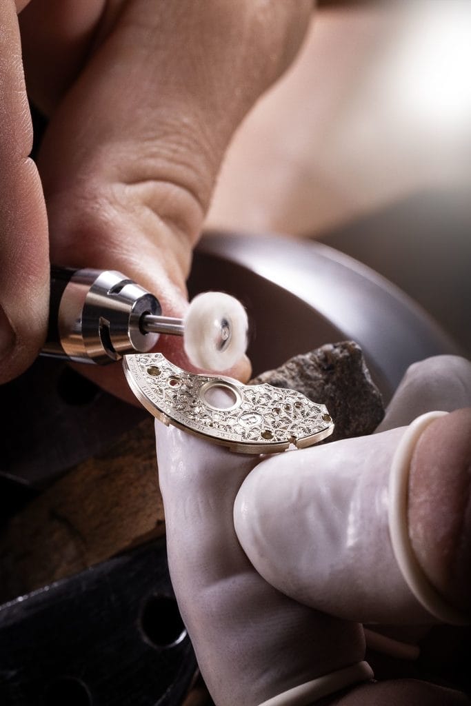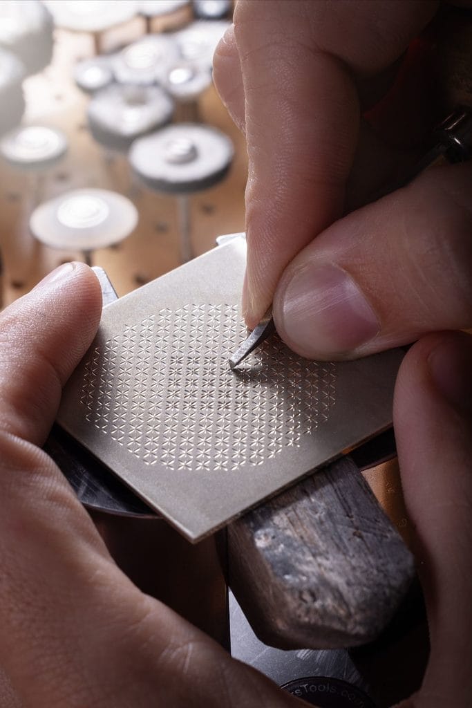La gravure a été confiée à l’Atelier Blandenier, l’un des rares ateliers suisses exclusivement dédiés à la gravure main pour la haute horlogerie. À l’échelle du microscope, chaque trait devient relief, chaque motif une micro-architecture, traduisant les lignes naturelles du palmier en un vocabulaire géométrique maîtrisé.