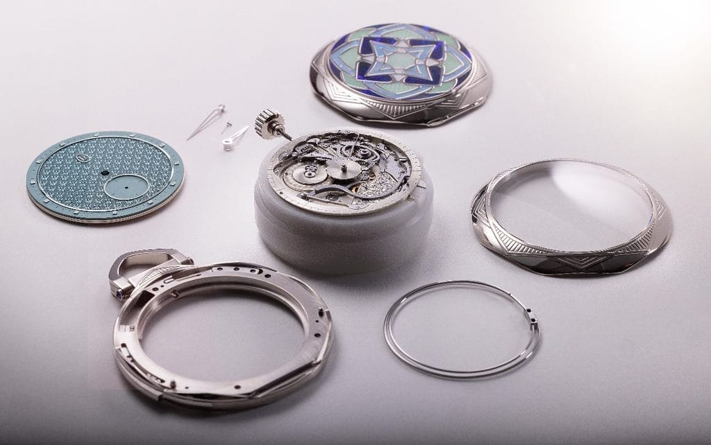 Cette géométrie naturelle, porteuse de sens et d’équilibre, irrigue l’ensemble de la création. Elle inspire la gravure du boîtier, du cadran et des ponts, ainsi que la marqueterie de pierres qui orne le fond. La Ravenale s’inscrit ainsi dans un dialogue subtil entre ciel et terre, mouvement et immobilité, matière vivante et structure immuable.