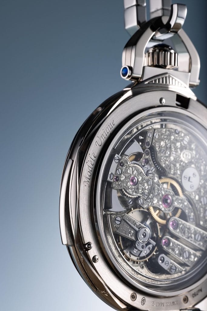 Les ponts, gravés de motifs inspirés du palmier du voyageur, transforment la structure mécanique en un langage ornemental, sans jamais sacrifier la lisibilité ni la fonction. Chaque composant, du barillet suspendu à arrêt de croix de Malte au balancier bimétallique coupé, témoigne de l’excellence genevoise des années 1920.