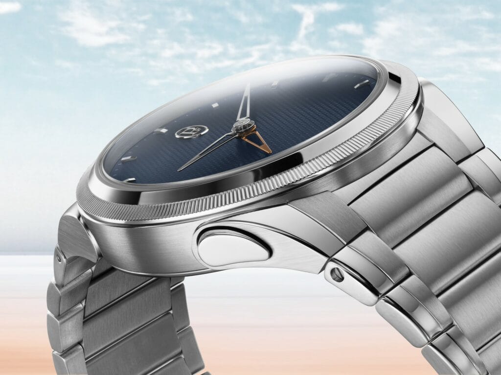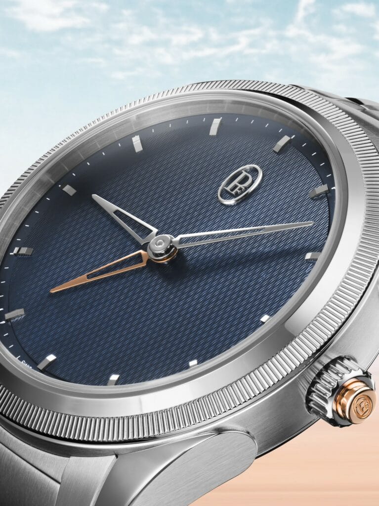 Le regard peut alors glisser sur le fin guillochage du cadran de type « grain d’orge », proposé dans une subtile teinte « Milano Blue ». Il peut se laisser emporter par le subtil effet visuel du guilloché cerclé par la minuterie sablée, du centre vers la périphérie en fonction de l’angle pris par la lumière. Les jeux de lumière sont mis à contribution pour souligner les interfaces entre les zones brillantes ou mattes de la lunette finement moletée, réalisée ici d’une seule pièce en platine.