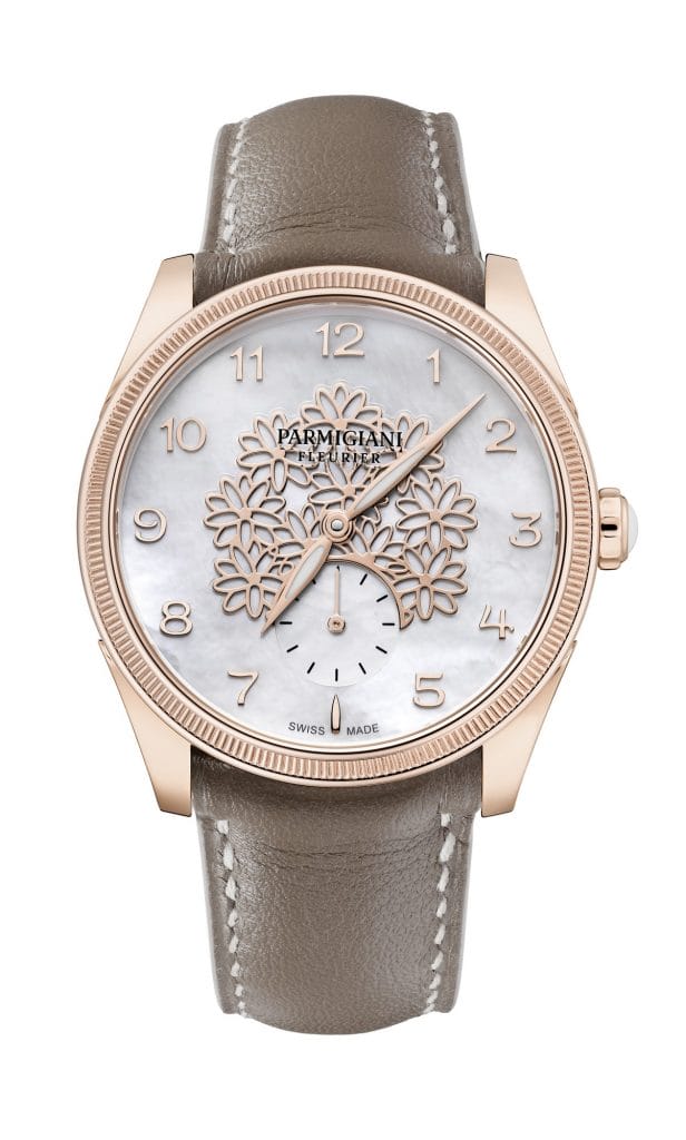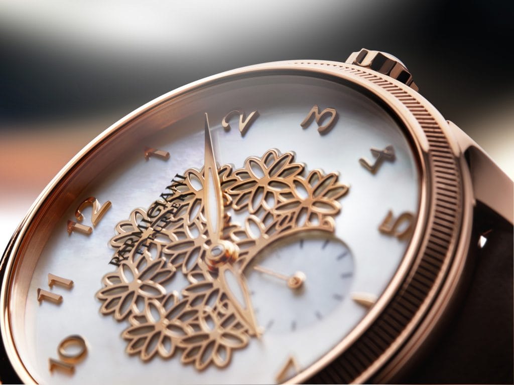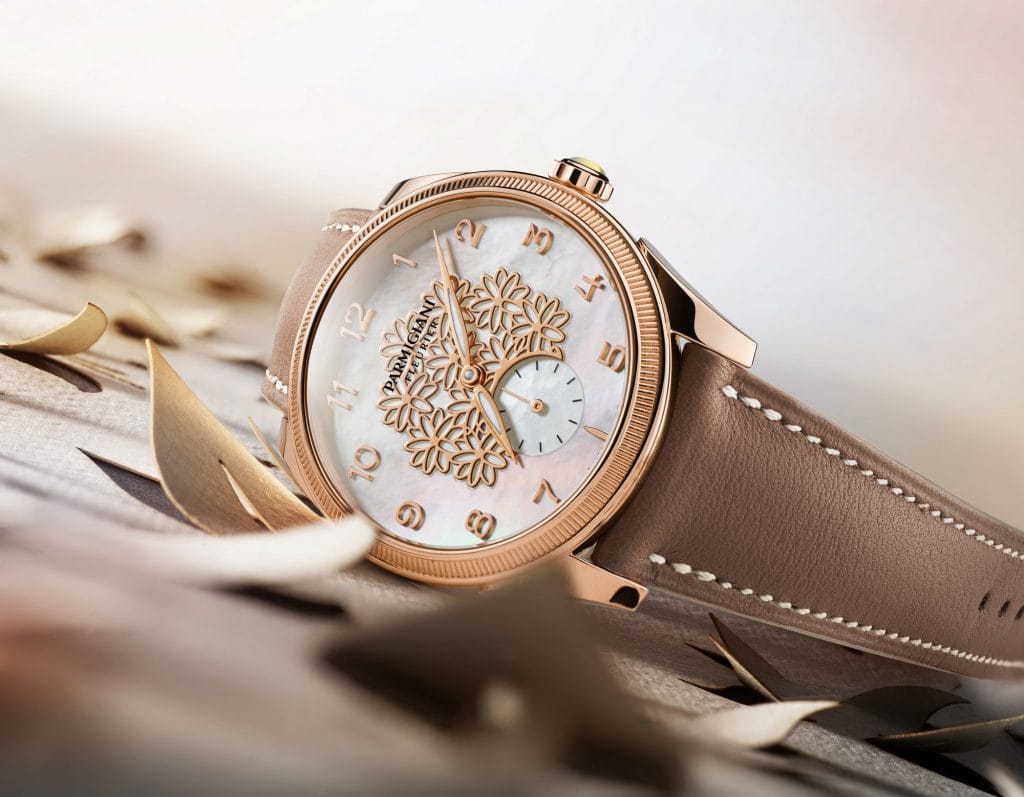 Féru de culture japonaise, Michel Parmigiani a dessiné un très élégant garde-temps féminin afin de célébrer à sa façon hanami, la coutume de l’archipel qui consiste à admirer la beauté des fleurs. Cette montre raffinée en or rose de la manufacture Parmigiani Fleurier est baptisée Toric Fleur et présente une fine dentelle de marguerites sur son cadran. En amoureux de la nature, c’est en effet le port et la grâce subtiles de cette fleur que le maître horloger apprécie au printemps dans les prairies vallonnées du Jura suisse.