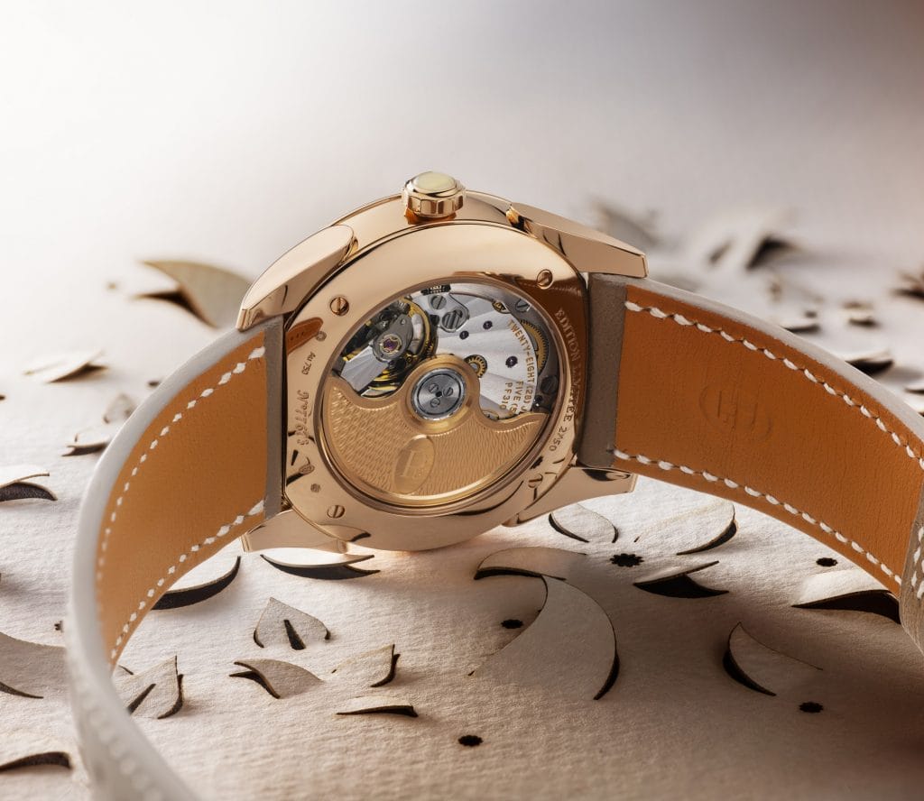 Cette montre présente une boîte en or rose d’un diamètre de 33.7 mm, assortie d’une lunette finement moletée typique de la collection Toric. Sur le cadran de nacre blanche sont appliqués des index chiffres arabes ainsi qu’une délicate dentelle d’or évoquant un tapis de marguerites, à l’image du duvet végétal qui orne les vallées suisses le printemps venu. Animées du calibre manufacture automatique PF310, des aiguilles feuilles, autre hommage à la nature, à matière luminescente indiquent les heures et les minutes. La petite seconde prend place à six heures. Le dos de ce précieux garde-temps offre un spectacle des plus saisissants, puisque les ponts présentent des côtes de Genève en éventail et que la masse en or arbore un somptueux guillochage grains d’orge. Un cabochon d’opale blanche orne la couronne de cette montre. Un bracelet veau Hermès étoupe complète ce garde-temps qui allie la poésie, la haute horlogerie, les matériaux les plus fins et l’élégance que confère la maîtrise de la simplicité.