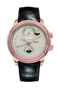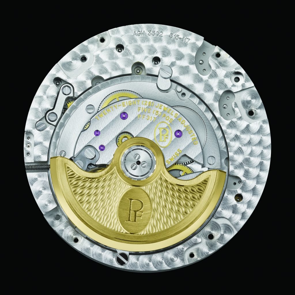 Le calibre PF 317 est également doté d’un quantième rétrograde instantané qui est indiqué par la troisième aiguille centrale. A mesure qu’elle progresse vers les chiffres de fin de mois, cette aiguille arme un ressort qui va la ramener avec d’autant plus de puissance vers le chiffre 1 – une translation de 240° si rapide qu’on ne peut pas observer le mouvement de l’aiguille à l’œil nu lorsqu’il survient.