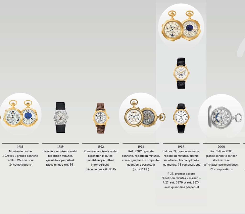 • Calibre 89, la montre portable la plus compliquée du monde, 33 complications, dont une grande et petite sonnerie et une répétition minutes sur quatre timbres ainsi qu’une alarme-réveil sur un cinquième timbre