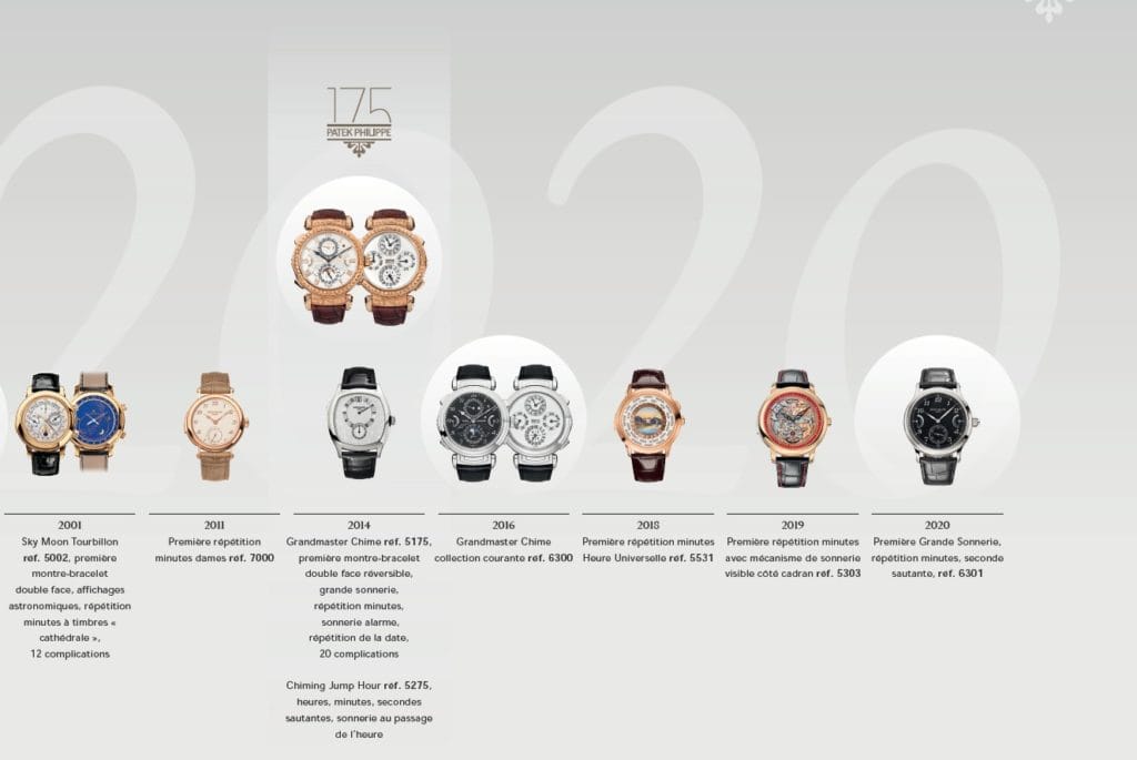 • Lancement de la Grandmaster Chime référence 5175, première montre-bracelet double face réversible Patek Philippe, avec 20 complications, dont une grande et petite sonnerie, une répétition minutes et deux premières mondiales brevetées : une alarme acoustique sonnant l’heure présélectionnée et une répétition de la date sonnant le quantième du mois à volonté