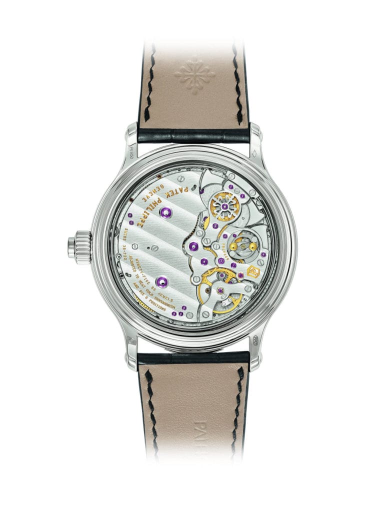 Le nouveau calibre GS 36-750 PS IRM – visible à travers un fond saphir transparent – remplit toutes les exigences très sévères du Poinçon Patek Philippe, qu’il s’agisse des performances techniques (précision, fiabilité), des finitions ou de l’architecture raffinée des divers composants. Un rappel que chez Patek Philippe, la complexité ne se conçoit jamais aux dépens de l’esthétique et que l’élégance d’un mouvement doit être validée par le président de la manufacture Thierry Stern – au même titre que le design d’un boîtier ou d’un cadran. Une grande attention a été portée au design des différents ponts, avec notamment un grand pont de barillet (caractéristique des grandes sonneries) et un coq (pont de balancier) traversant, une rareté chez Patek Philippe, qui assure à la fois une bonne assise et un bel équilibre visuel. Les connaisseurs admireront de nombreux autres détails esthétiques, dont de multiples angles rentrants, particulièrement difficiles à polir. Le régulateur à volant inertiel permettant de régler le tempo de la sonnerie s’offre pour la première fois aux regards, avec ses terminaisons adoucies et polies. Ce grand spectacle du mouvement est complété par le balancier Gyromax®, le spiral Spiromax® en Silinvar® et les trois timbres enroulés autour du mouvement, avec leurs marteaux respectifs. Le fond saphir antireflet placé très près du calibre renforce l’impression de plonger au coeur de la mécanique. La montre est également livrée avec un fond plein interchangeable en platine.