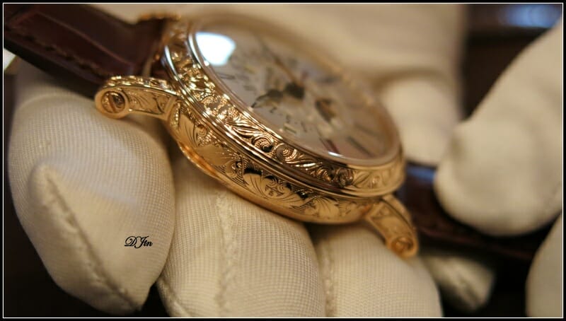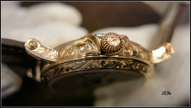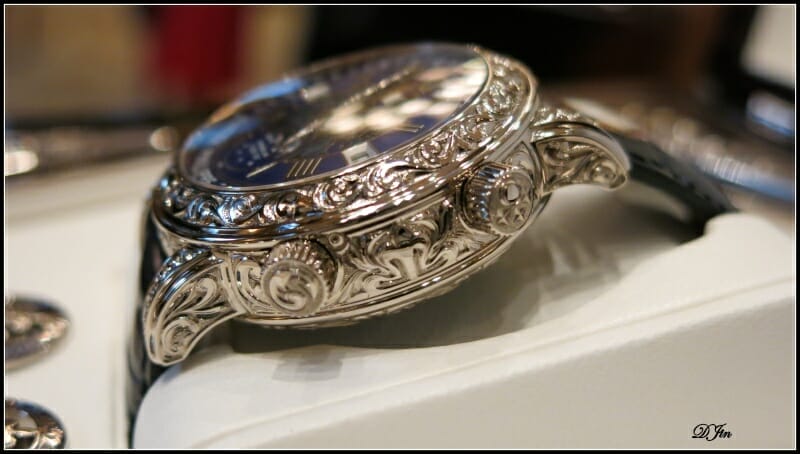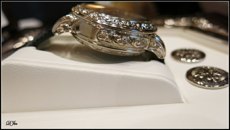 Mais la grande différence visuelle est bien sûr due à l’utilisation de 2 métiers d’art remarquables : la gravure (autant dire ici la sculpture !) du boîtier et l’émaillage du cadran en champlevé et en cloisonné. Impossible à décrire, il faut admirer…