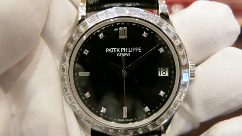 Et la Calatrava 5298 en platine, ici avec lunette sertie de diamants baguette et cadran noir rehaussé d’index diamants ! L’idéal bien sûr pour ces messieurs avec un smoking mais parfaite aussi avec une robe de soirée, n’est-ce pas ?