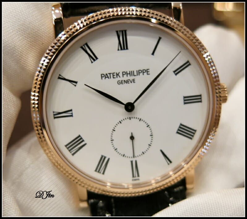 La Calatrava 5116 en or rose avec cadran émail blanc et guillochage « Clous de Paris » sur la lunette, petite seconde, calibre 215.