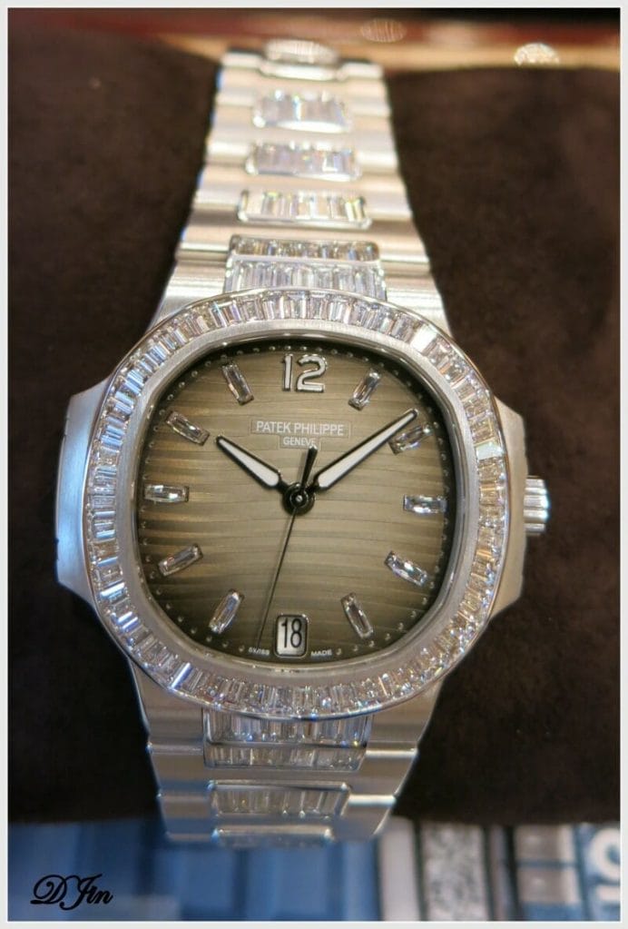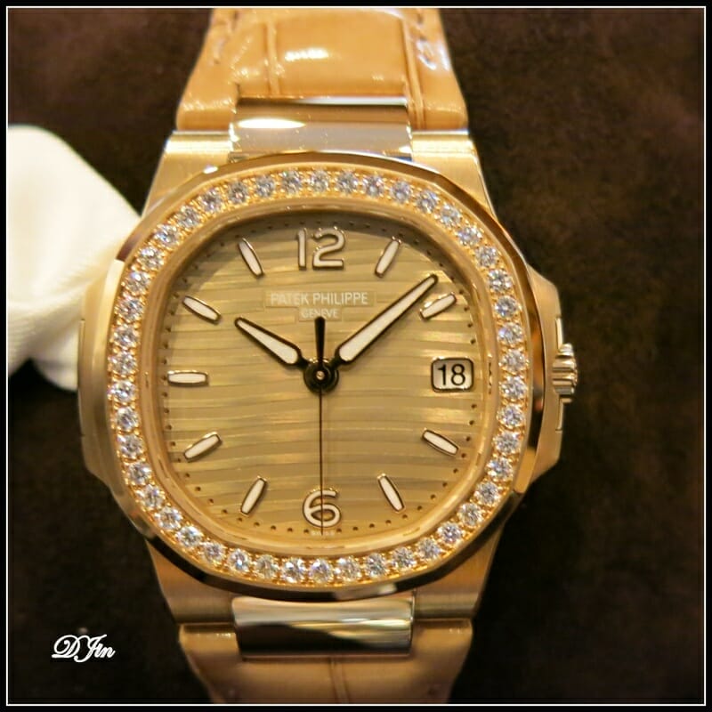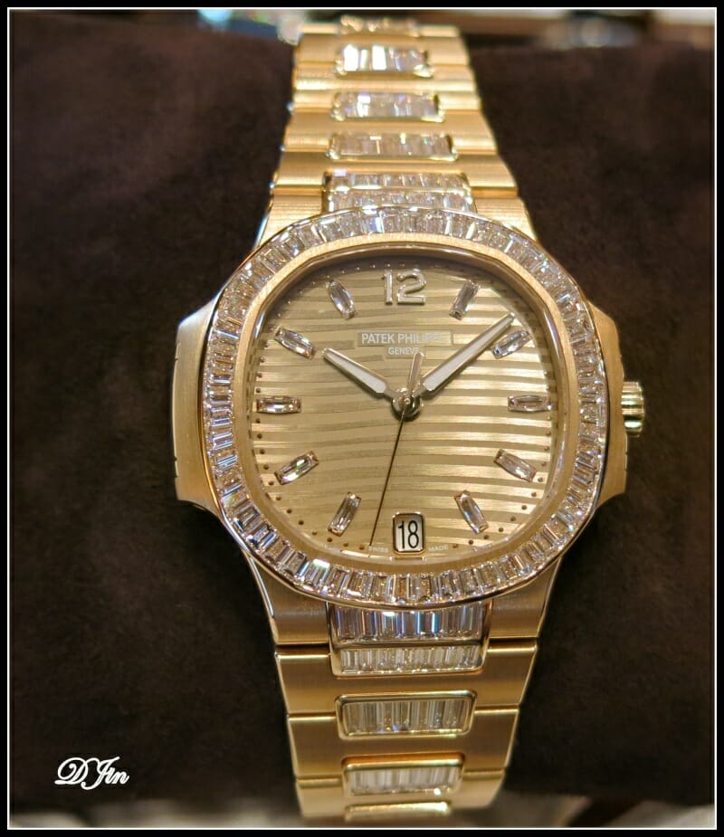 Mais la ligne Nautilus Dame est également déclinée en modèle haute joaillerie avec cette somptueuse 7014/1 automatique en or gris ou rose à la lunette et au bracelet sertis de diamants baguette étincelants que nous vous laissons admirer dans ses deux versions.
