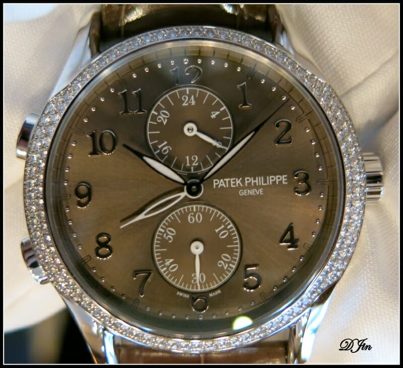 La Calatrava Travel Time 7134 offre ainsi dans un écrin d’or gris de 35 mm serti de diamants la possibilité de disposer d’un second fuseau horaire pour l’affichage simultané de l’heure locale au moyen des aiguilles luminescentes et de l’heure du domicile via l’aiguille d’heure ajourée, associée à un cadran auxiliaire 24h pour l’indication jour/nuit. Une petite seconde à 6h vient compléter les informations qui se détachent sur le très original brun soleil du cadran.