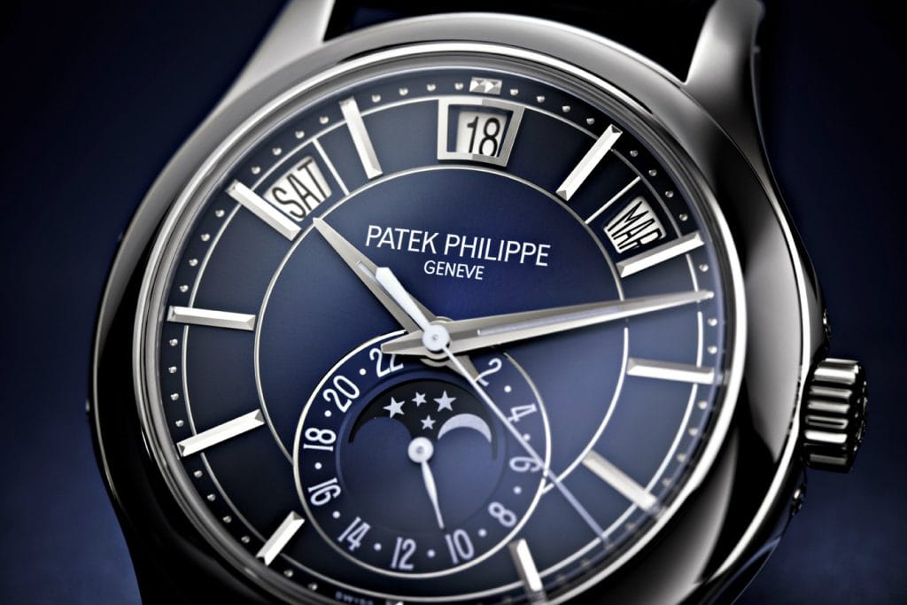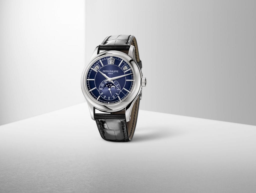 Reconnaissable à ses trois guichets en arc de cercle pour le jour, la date et le mois, le Quantième Annuel référence 5205 a été lancé en 2010 dans un boîtier en or gris marié à deux variantes de cadrans deux tons dans des nuances de gris et de noir. Le choix a été complété en 2013 par une version en or rose avec cadran blanc opalin ou laqué noir. Patek Philippe donne un nouveau visage au modèle en or gris en mariant l’éclat discret du métal précieux à un élégant cadran deux tons bleu « soleil » présentant un subtil effet de dégradé noir depuis la périphérie. Un style sobre, dynamique et contemporain, rehaussé par des index appliques en or gris et de nouvelles aiguilles de type « dauphine » trois faces avec revêtement luminescent.