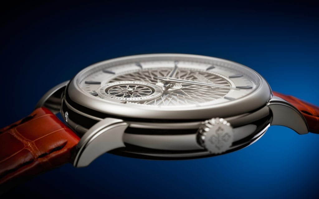 Le fond en verre saphir permet d’admirer les marteaux et les timbres classiques de la répétition minutes ainsi que le levier en forme de diapason sur lequel est fixée la plaque vibrante transparente du système d’amplification fortissimo. Une croix de Calatrava ajourée coiffe le système de volant inertiel assurant une cadence parfaitement régulière de la sonnerie. Le grand spectacle du mouvement met aussi à l’honneur le balancier Gyromax® , le spiral Spiromax® en Silinvar® lancé par Patek Philippe « Advanced Research » en 2006 et un grand pont orné de Côtes de Genève et d’arêtes soigneusement anglées et polies. Le mini-rotor en platine arbore un décor rayonnant faisant écho au cadran – obtenu grâce à une technique de texturation de surface au laser piégeant la lumière, ce qui a pour effet de faire apparaître certaines parties en noir. Cette série limitée se porte sur un bracelet en alligator de couleur orange brillant avec coutures contrastées noires et boucle déployante en platine.