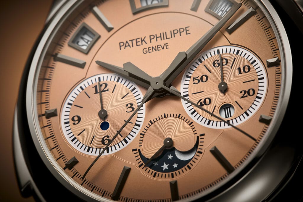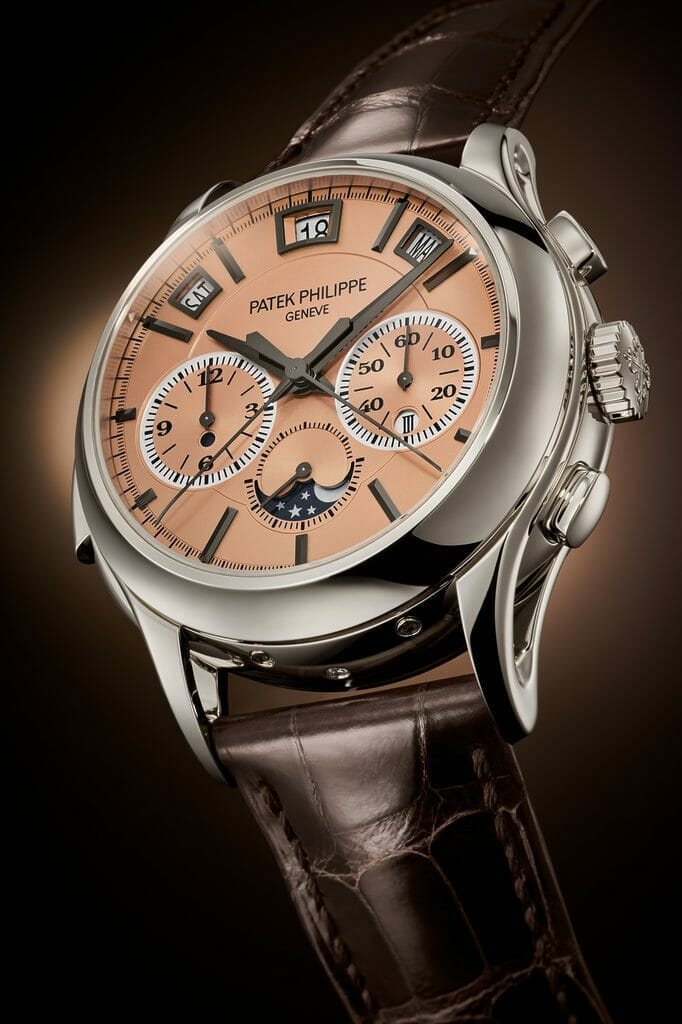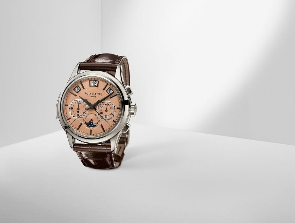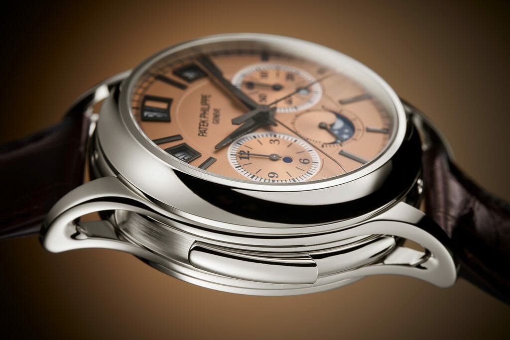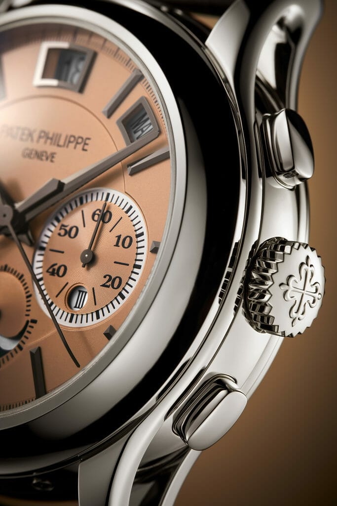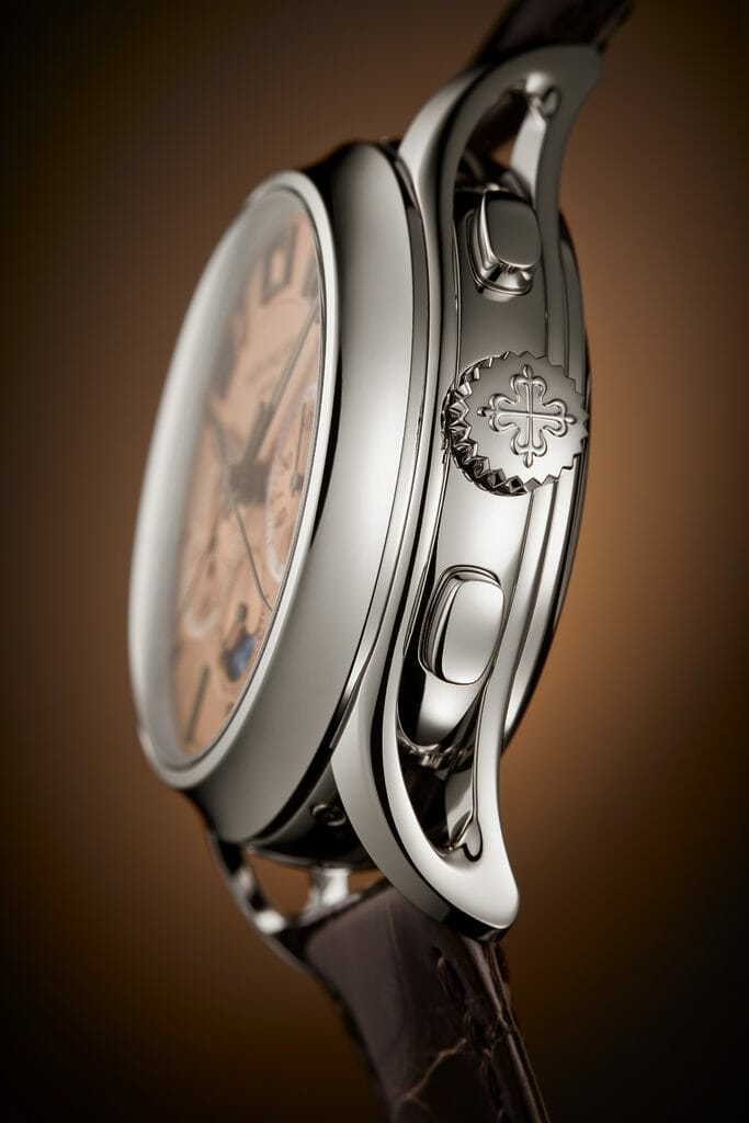 Dévoilée en première mondiale dans une série limitée à 15 exemplaires à l’occasion de la grande exposition « Watch Art » de Tokyo 2023, la nouvelle référence 5308P-010 à remontage automatique réunit une répétition minutes, un chronographe à rattrapante doté de deux nouveaux mécanismes brevetés et un quantième perpétuel instantané à guichets. Une vraie prouesse de miniaturisation et de gestion de l’énergie. Cette Quadruple Complication avec nouveau calibre R CHR 27 PS QI aux performances optimisées a pour écrin un élégant boîtier en platine avec attaches de bracelet ajourées, marié à un cadran doré or rose opalin.